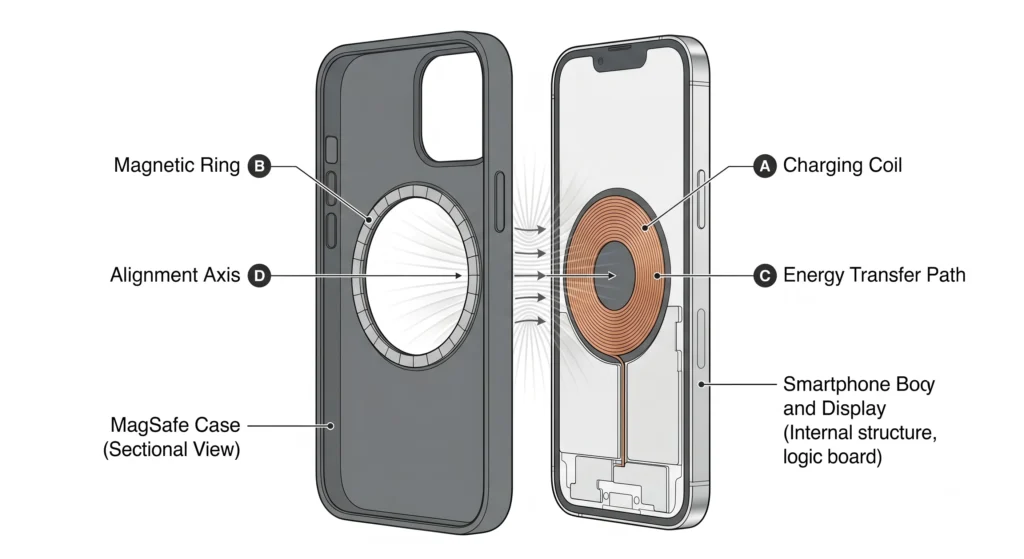 For MagSafe charging: The system works differently. The magnet ring actively guides coil-to-coil alignment during charging — it is both a mechanical and functional component. Apple specifies the magnet array precisely, and deviations in field strength, ring diameter, or placement affect charging speed and accessory compatibility. Apple’s MagSafe documentation outlines these specifications for licensed manufacturers.